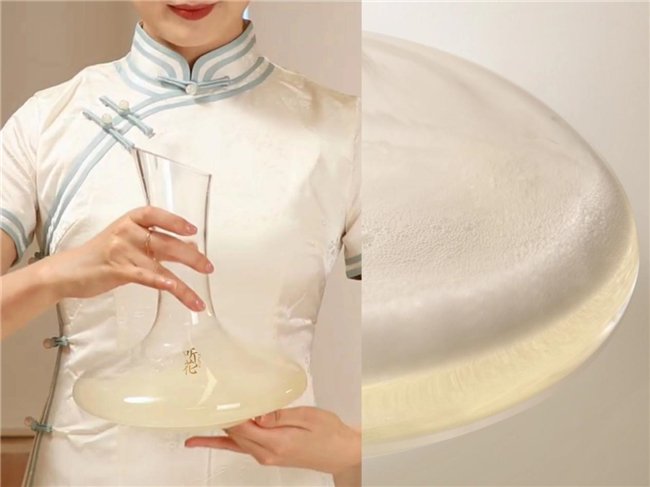 “听花堆雪”可视化呈现。注入500ml酒液,恰好至最宽液位线,用力摇晃约10次,壶内即涌起细密层叠的洁白酒花。因听花酒体缔合紧密、风味物质丰富,酒花晶莹如雪、经久不散,完美演绎“听花堆雪”的意境。再摇约20次,酒液与空气充分融合,香气满溢。此间视觉与嗅觉的双重盛宴,酒未入口,就已让人垂涎欲滴。